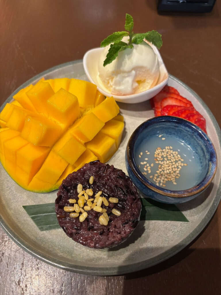 We finish with a shared mango sticky rice, the portion so modest we laugh at the sight of it. For me, that’s a relief: sweet rice usually recalls the gloopy riz au lait of my primary school canteen. Here, though, the flavour more than makes up for the size.